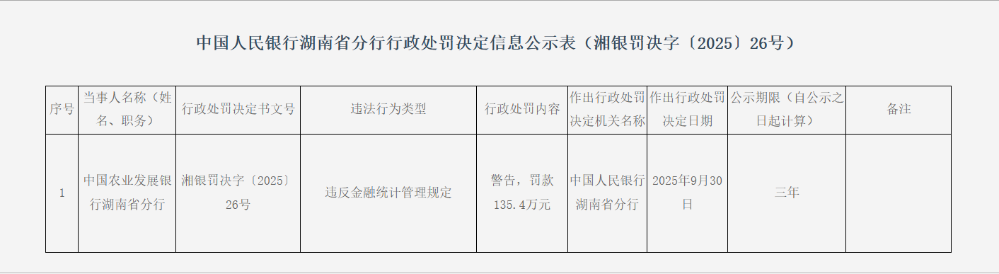 10月15日,中国人民银行湖南省分行行政处罚决定信息公示表显示,中国农业发展银行湖南省分行因违反金融统计管理规定被警告并罚款135.4万元。